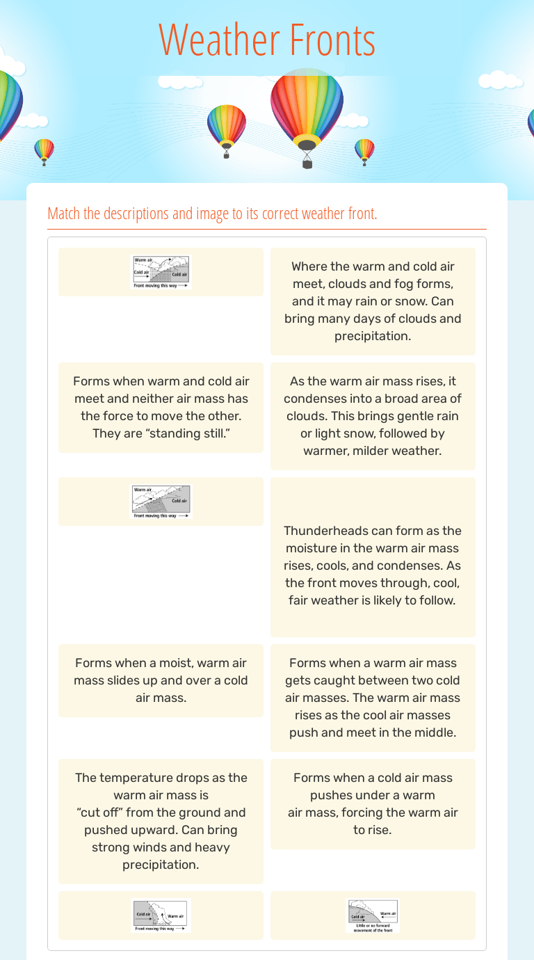 About the fronts that are so dominant in forming the weather around you? When two air masses meet, they form a front. A front causes a change in weather conditions, which usually includes some type of clouds and precipitation. Warm front, cold front, stationary front, . Type in front as it forms the weather it creates a cold front shape when cold air masspresses under warm air mass forcing warm . Print answers · cold fronts. There are several kinds of weather fronts that help meteorologists predict the weather. A cold front occurs when a cold air mass pushes . Browse weather fronts resources on teachers pay teachers, a marketplace trusted by millions of teachers for original educational . When two unlike air masses meet, what usually keeps them separate? The image below shows a surface pressure chart, on which isobars, fronts and pressure systems have . What kind of weather does a warm front generally produce? Then label each drawing correctly:
